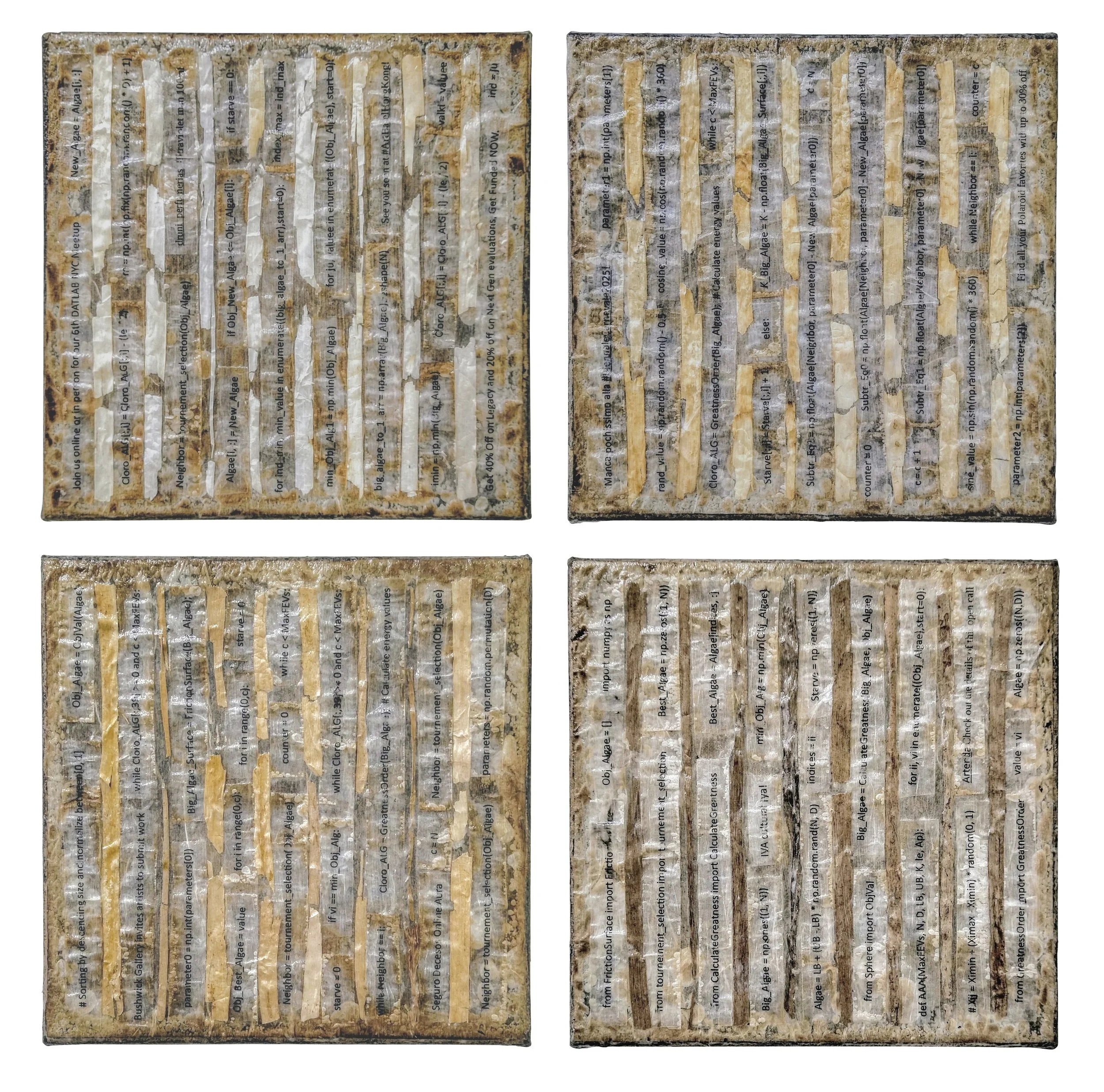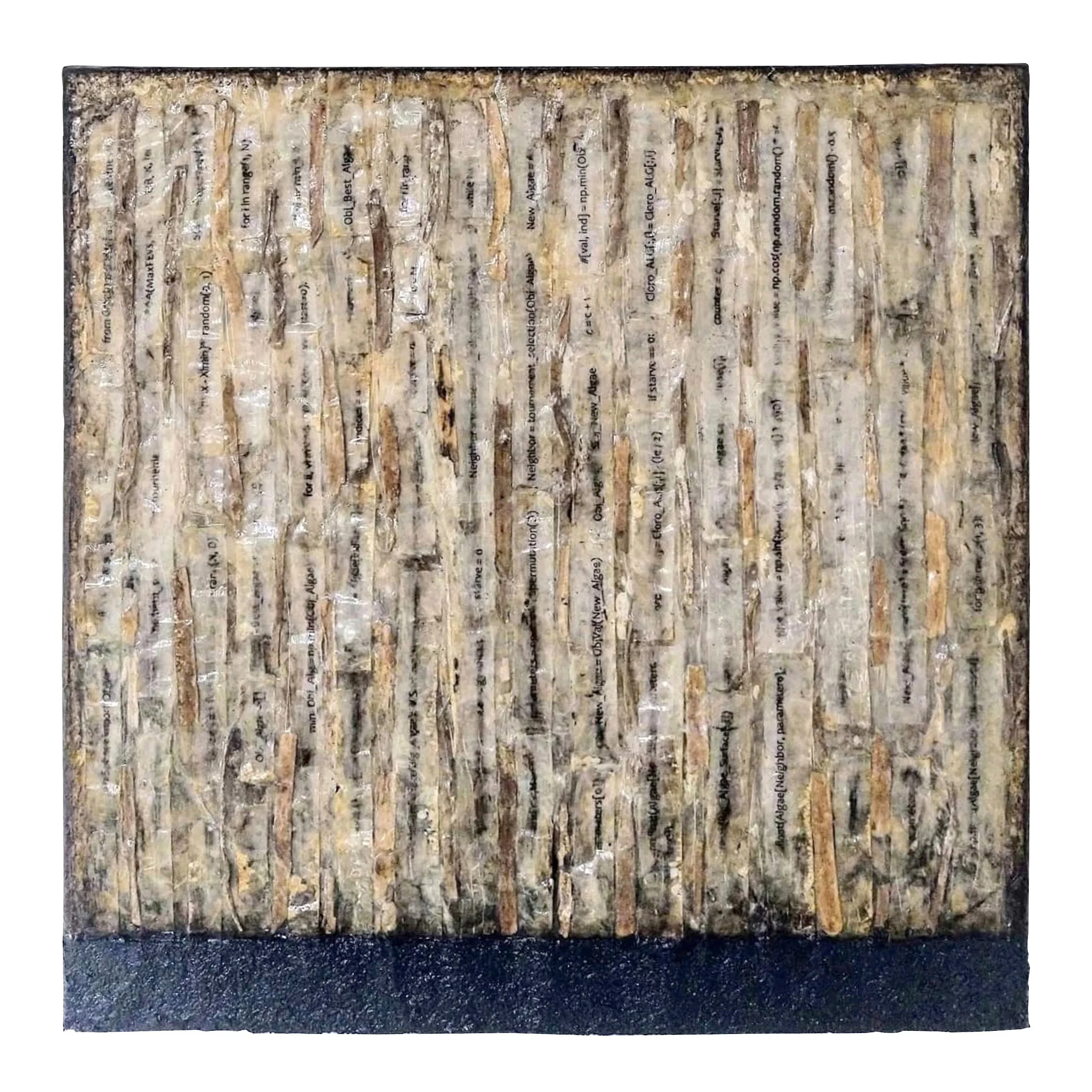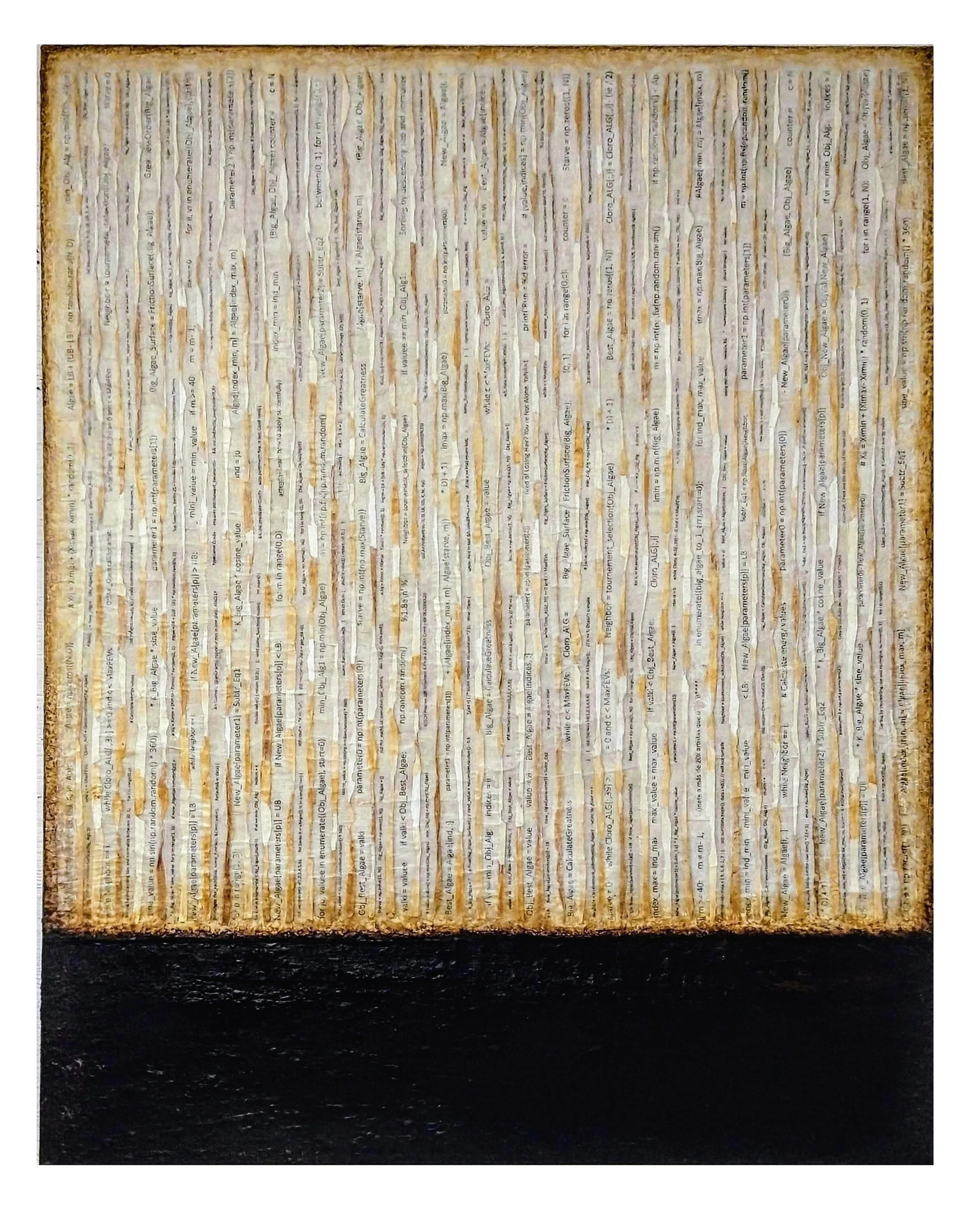 Mixed media, collage, natural algae modified, algorithmic codes, and tar on canvas.