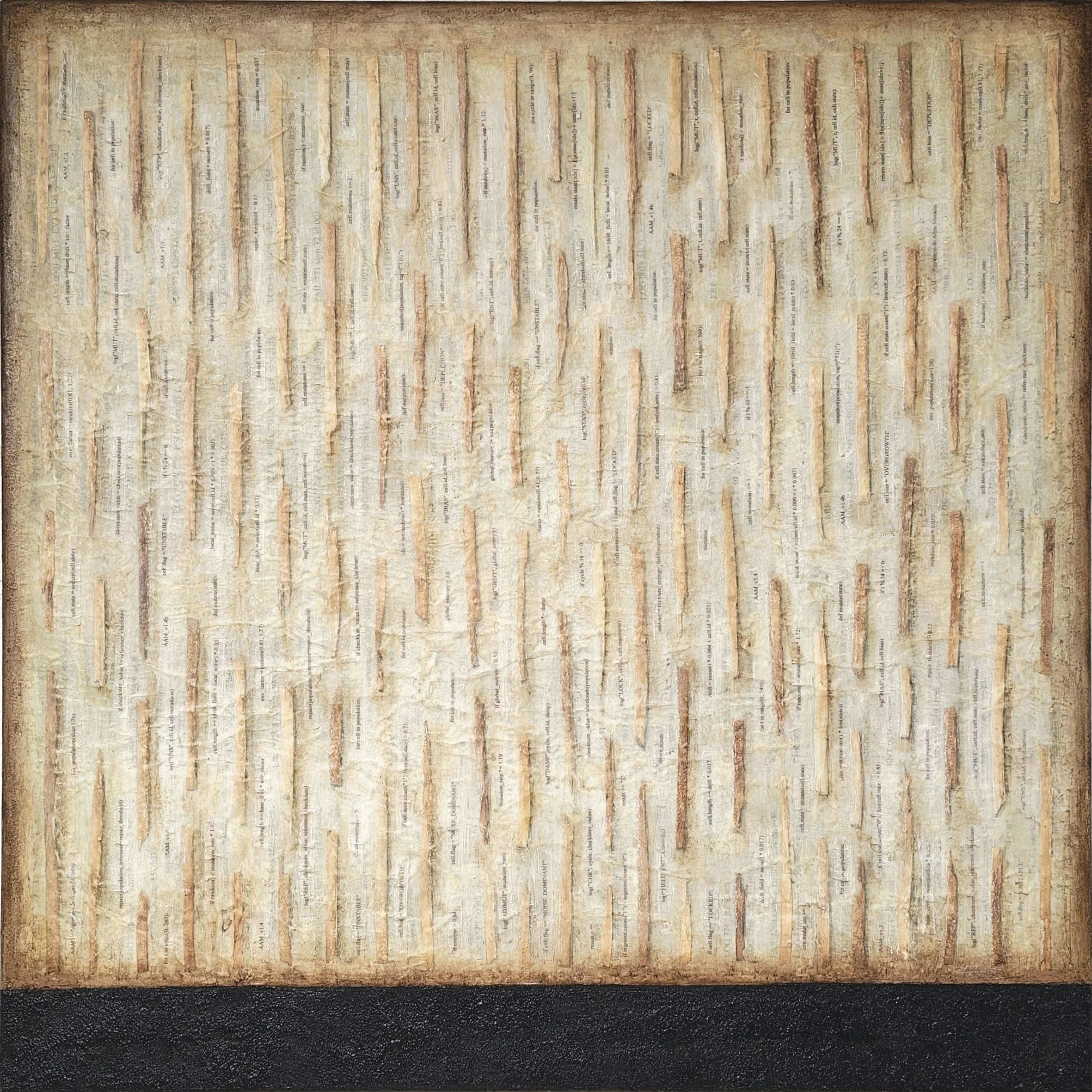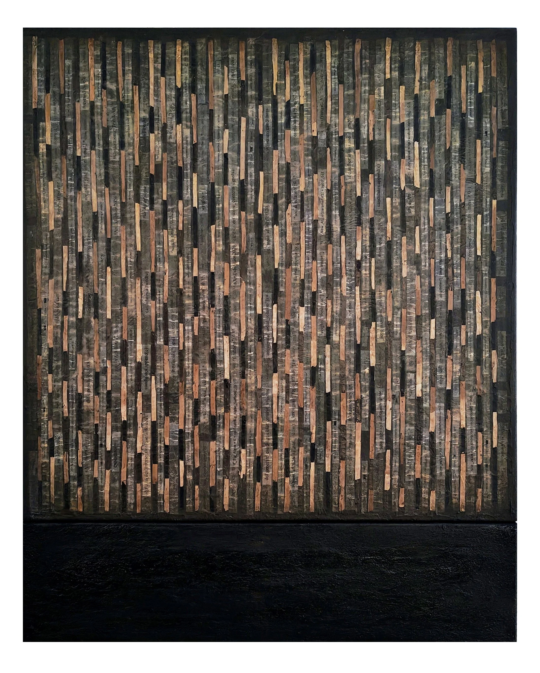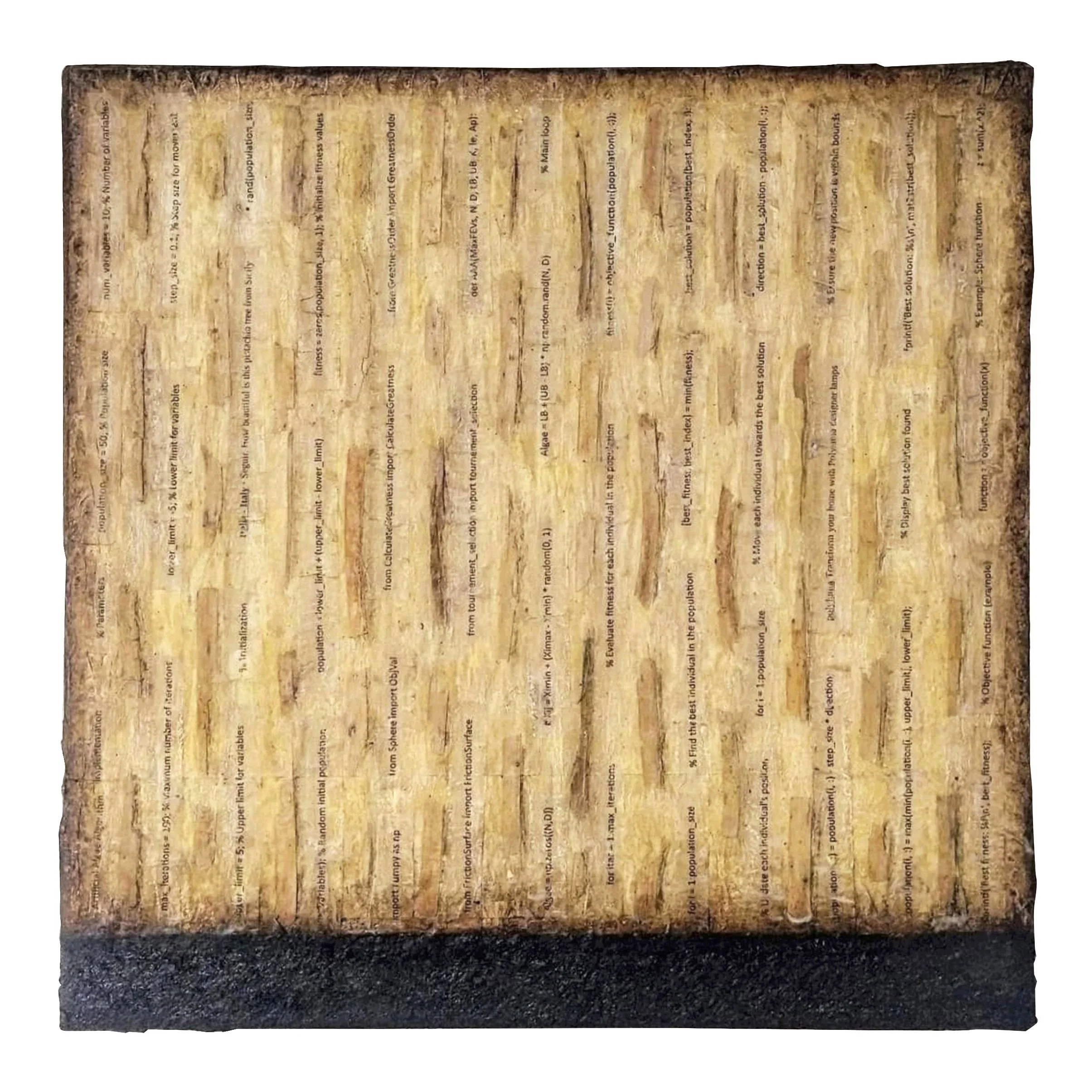 Mixed media, collage, natural algae modified, algorithmic codes, and tar on canvas.